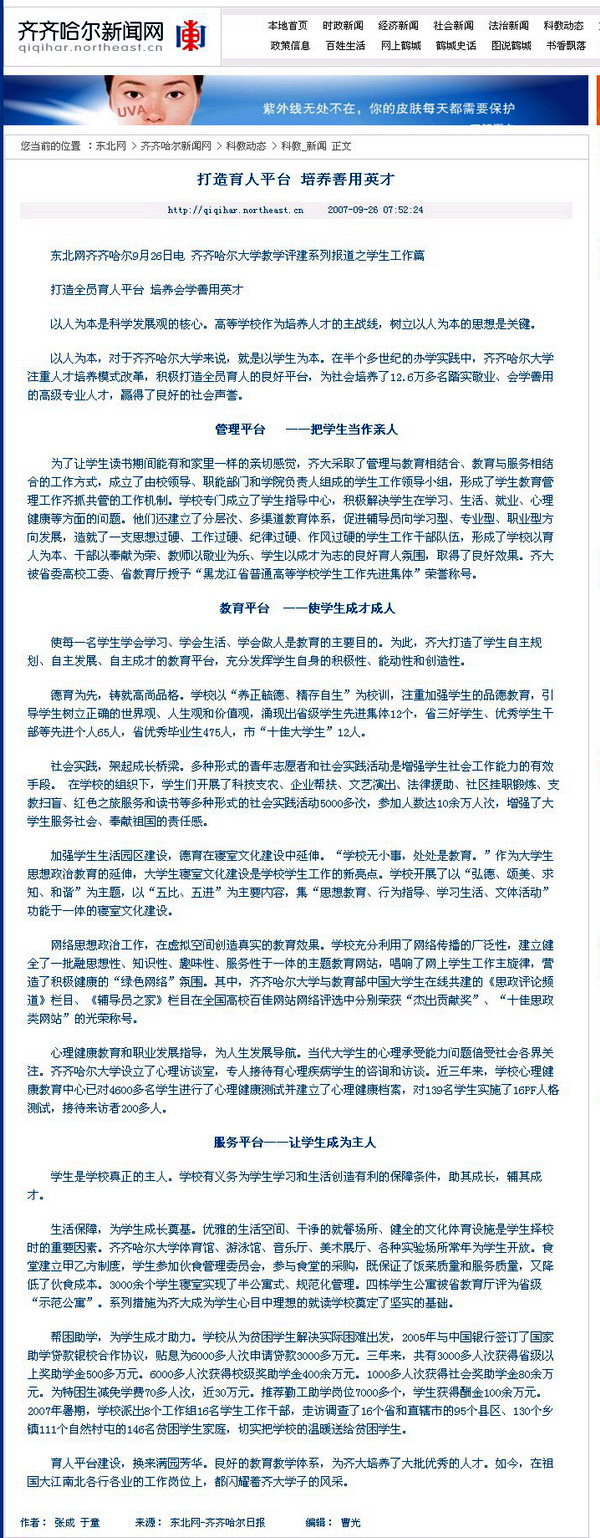 编者按:9月26日,《齐齐哈尔日报》刊发“LETOU国际米兰官网教学评建系列报道之学生工作篇”:“打造全员育人平台培养会学善用英才”。