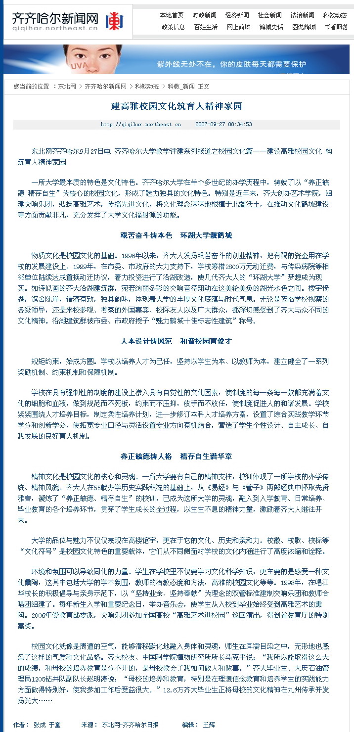 9月27日,《齐齐哈尔日报》刊发“LETOU国际米兰官网教学评建系列报道之校园文化篇”:建设高雅校园文化 构筑育人精神家园。