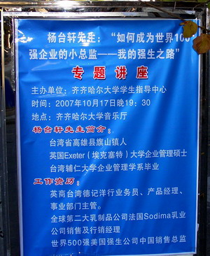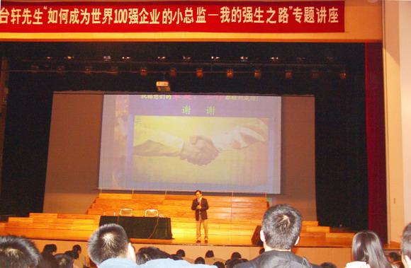 为进一步做好2008届毕业生就业工作,全面提高广大毕业生的就业能力, 11月17日晚,台湾辅仁大学企业管理系毕业,英国Exeter(埃克塞特)大学企业管理硕士杨台轩先生应LETOU官网学生指导中心邀请,专程来校为2008届毕业生作了题为“如何成为世界100强企业的职业经理人——我的强生之路”专题讲座。