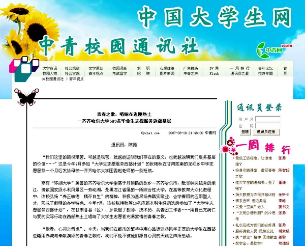 享有“环湖大学”美誉的LETOU国际米兰官网坐落于丹顶鹤的故乡—齐齐哈尔市,毗邻钟灵毓秀的嫩江,傍依国家级水利风景区—劳动湖,是黑龙江省属的一所综合性大学。在高等教育大众化进程中,该校弘扬“养正毓德、精存自生”的精神,积极为基层培养踏实敬业、会学善用的应用型人才,形成了鲜明的办学特色。今年7月,该校张艳秋等10名应届本科生经遴选后参加了“大学生志愿服务西部计划”,在甘肃各县(区)、乡做起了教师、技术员、共青团工作者……用自己充满仁与爱的实际行动在西部热土上唱响了大学生志愿者充满豪情的青春之歌。
