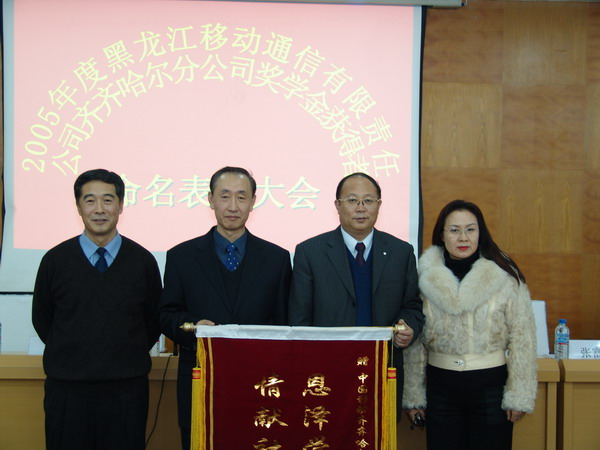 命名表彰大会上,副校长姜守训宣读了《LETOU国际米兰官网关于命名表彰2005年度“黑龙江移动通信有限责任公司齐齐哈尔分公司奖学金”获得者的决定》;校领导及嘉宾分别为该项奖学金获得者代表颁发了证书和奖金;校长唱江华、副校长姜守训代表学校向黑龙江移动通信有限责任公司齐齐哈尔分公司总经理董向辉、副总经理张富敏赠送了写有“恩泽学子显风采,情献社会谱新篇”的锦旗。