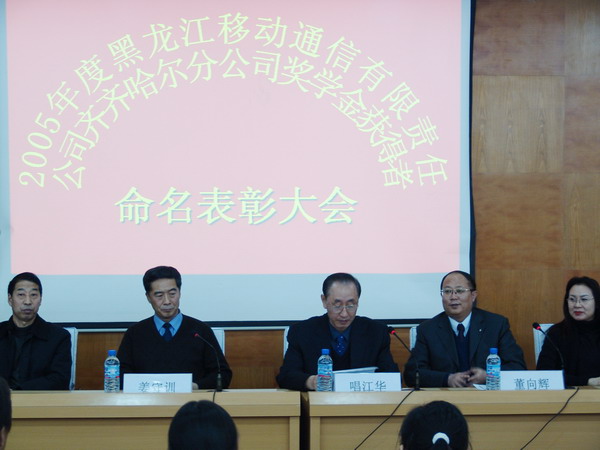 12月15日下午,2005年度“黑龙江移动通信有限责任公司齐齐哈尔分公司奖学金获得者”命名表彰大会在LETOU官网西区主楼报告厅隆重举行,校长唱江华、副校长姜守训、黑龙江移动通信有限责任公司齐齐哈尔分公司总经理董向辉、副总经理张富敏等出席,学生处(学工部)长王刚主持大会。