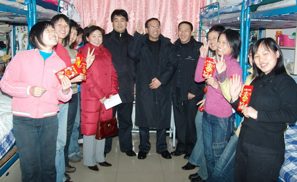 2006年1月26日晚,校学生处副处长吴宝柱与学生资助科科长张培华、舍务科科长王国义、学生资助科李静老师等带着学校领导的亲切嘱托来到4#、14#、15#学生公寓,看望并慰问在春节期间留校度寒假的大学生。 学生处有关人员一行向在春节期间留校度寒假的大学生转达了学校领导的关怀与慰问之情,向他们致以节日的祝福。