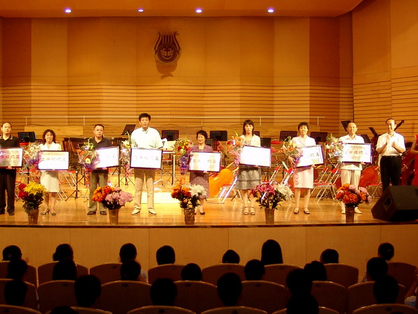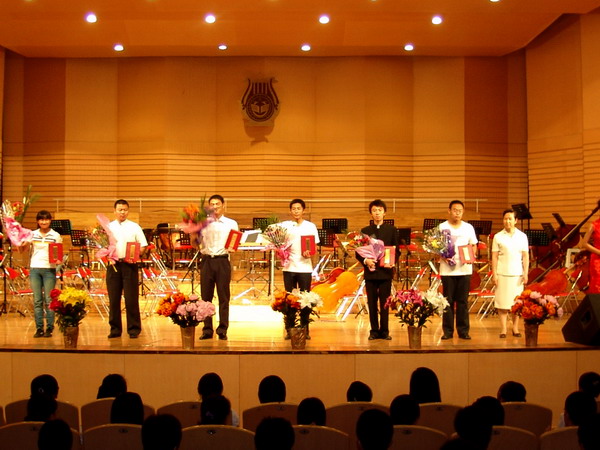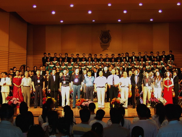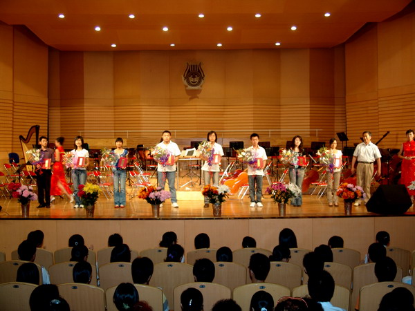 在全场观众的掌声与喝彩声中,音乐会圆满结束,出席音乐会的评估专家与校领导登台与演职人员一一握手并合影留念。