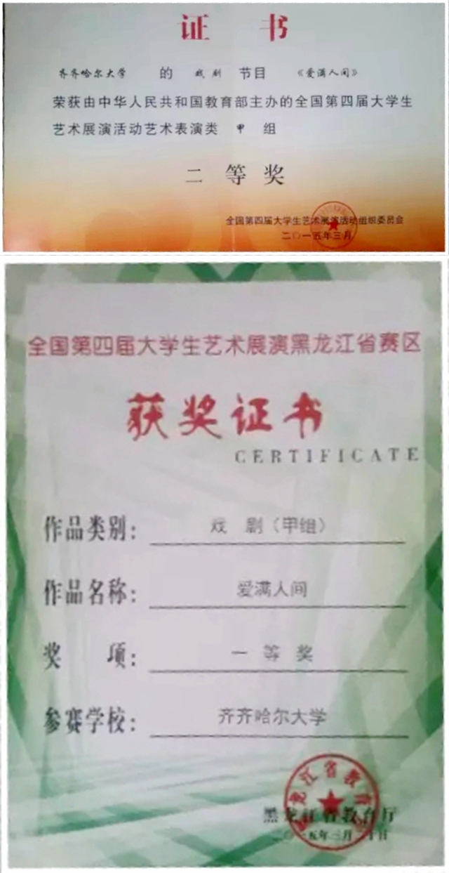 原创话剧《爱满人间》曾获得全国第四届大学生艺术展演黑龙江省赛区戏剧类一等奖、全国第四届大学生艺术展演活动艺术表演类二等奖。