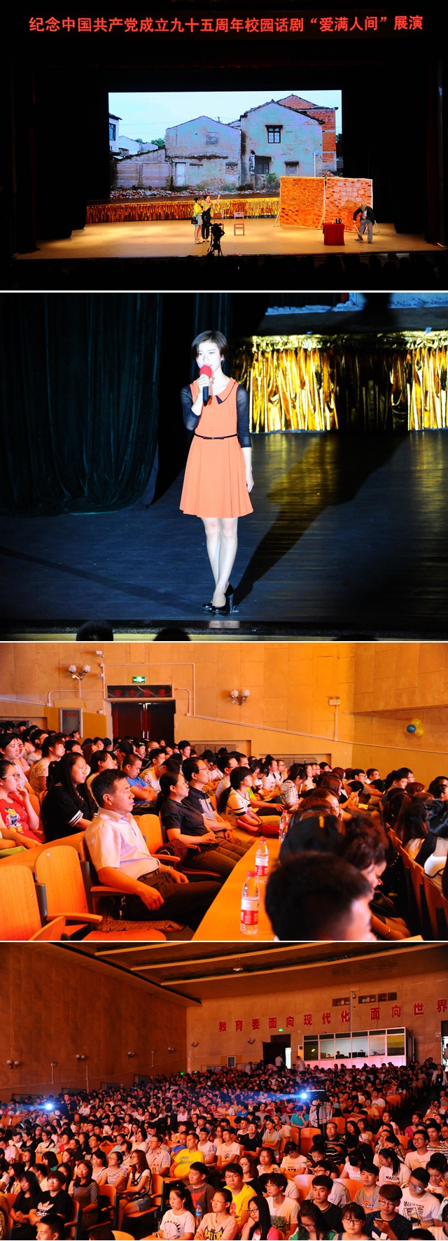 6月21日下午,纪念建党九十五周年原创话剧《爱满人间》展演在LETOU官网文化宫演出。校党委宣传统战部副部长何强,教育与传媒学院党委书记于学江,院长李虹,院党委副书记兼副院长袁冰岩等与千余名师生一起观看了话剧演出。