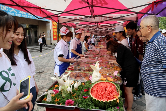 民以食为天,食以安为先。本次食品展销的食品均是各食堂亲自加工制作的,食品来源安全、可靠,饮料、水果展销商也是具有食品安全和营业资质的商家。活动现场,遮阳伞架下,来自学生一至八食堂的美食展销单位依次排列,展台上摆满了特色繁多的美食精品,各食堂师傅纷纷亮出自己的绝活,龙凤呈祥、孔雀开屏、松鹤延年、天降祥龙等精美食材雕刻让在场的人们惊叹不已。300余种主副食品芳香四溢、五味俱全:烤全羊味道十足、特色烤串儿香飘十里、红烧肉油而不腻 、炸鸡翅香脆质嫩、板粟鸡块咸甜适中、麻辣鳕鱼麻辣鲜香、糖醋排骨酸甜可口、美味香春卷鲜美甘脆、水果沙拉清爽多汁、豆沙凉糕香甜软糯……现场师生和市民纷纷拿出手机、相机进行拍照并第一时间利用微信、微博等新媒体发到朋友圈,晒美食乐事,表达愉悦心情,一时间人们纷纷在网上为学校食堂厨师的精湛厨艺点赞。美食展销,蜚声校园内外,赢得一片点赞。