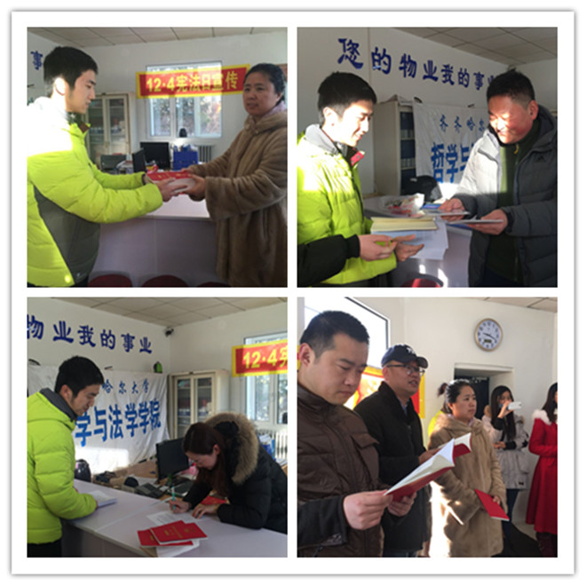 12月4日上午,哲学与法学学院副院长、法学专家苗绘教授和法学系主任李娜副教授带领法学专业师生,冒着严寒来到了文化街道兴海社区,为社区居民进行了普法宣传活动。活动分为三个部分:首先由法学专业学生向社区居民讲解国家宪法日的由来、宪法日的重要意义以及与百姓生活密切相关的法律知识;其次由学生们给小区居民赠送宪法书籍、发放宣传资料、进行问卷调查等;第三,学生们结合所学知识为社区居民现场进行了法律咨询活动。哲学与法学学院以“12.4” 国家宪法日暨全国法制宣传日为契机,组织开展了一系列普法宣传活动,营造了师生学法遵法守法用法的氛围。