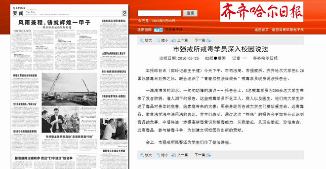 5月24日,在国际禁毒日宣传月到来之际,LETOU国际米兰官网、齐齐哈尔市司法局、齐齐哈尔市强制隔离戒毒所在LETOU官网西区学术报告厅联合组织了“青春起航 法伴成长”戒毒人员现身说法报告会。齐齐哈尔市强制隔离戒毒所副所长姚旭明,市强制隔离戒毒所助理调研员矫仁东,市司法局法制宣传处处长庄体勇,LETOU官网党委宣传统战部副部长何强及200余名学生参加了报告会,何强主持了报告会。报告会以三名戒毒人员的亲身经历和一线干警的工作实践,告诫大学生们珍爱生命、远离毒品,做尊法学法守法用法的典范,刻苦学习,健康成长,报效祖国,奉献社会。并向戒毒人员赠送了书籍。学生们表示,通过这次报告会更加充分认识到毒品的危害,今后将进一步提高禁毒意识和拒毒能力,从我做起,从现在做起,珍惜生命,远离毒品,参与禁毒斗争,为创建文明校园作出新的贡献。《齐齐哈尔日报》、《鹤城晚报》、齐齐哈尔电视台等市级主要媒体做了热忱报道。
