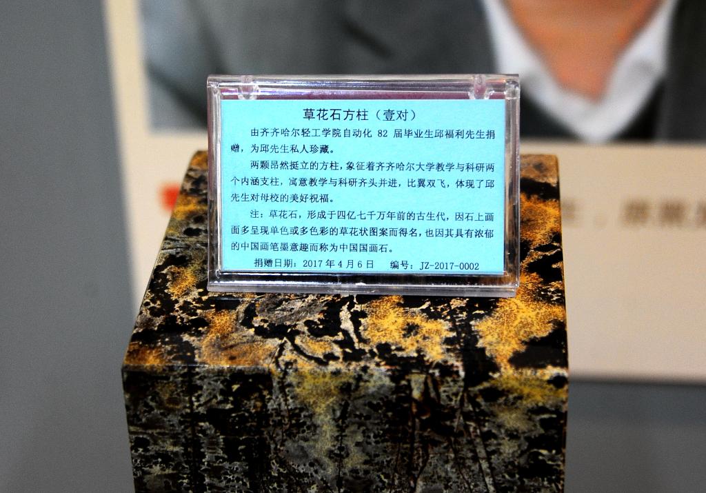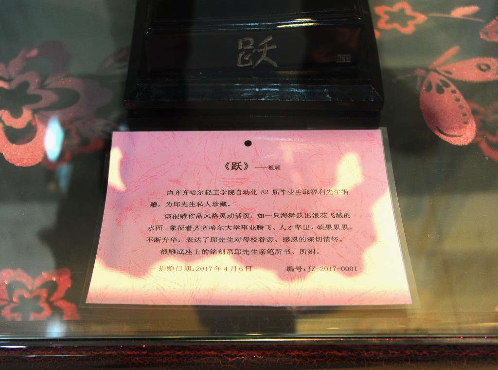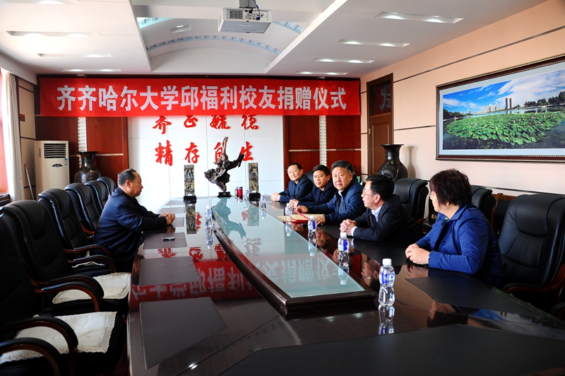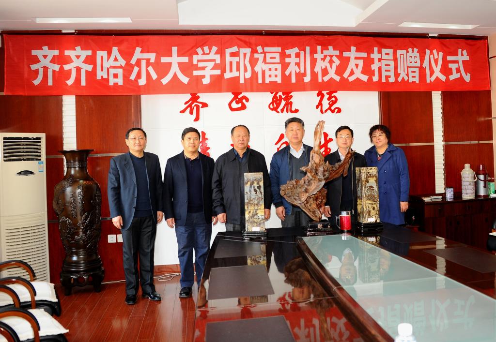 邱福利校友在讲话中表示,母校对于他来说,具有非常深厚的感情和特殊的意义,他于1982年毕业留校,后来又调入齐齐哈尔医学院工作,到现在已经工作了30多年,是母校培养了他,给与他专业的知识,教会他做人的道理,他也把青春年华献给了母校。在退休之时向母校捐赠有纪念意义的物品,既是应有之义也是感恩之情。他说,捐赠给母校的根雕《跃》是一只将要腾飞的丹顶鹤的形象,预示着齐大人才辈出,硕果累累,不断升华;两个草花石方柱昂然挺立,一个象征着教学,另一个象征着科研,教学和科研是推动高校发展的两翼,是高校人才培养的两大内涵支柱,希望母校将两者有机结合起来,实现教学科研“比翼齐飞”,推进学校内涵式发展,创建更加良好的育人环境,进一步提高服务地方经济社会发展的能力。邱福利校友表示,会一如既往地关心、关注母校的发展,尽自己所能为母校发展做贡献,并祝愿母校在高水平大学建设事业中取得更加辉煌的成就。