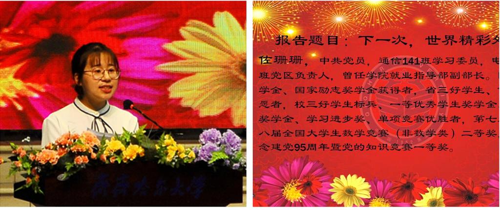 此次报告团成员中有综合成绩优异、学习能力突出的学习标兵;有自立自强、在逆境中迎难而上的自强之星;有在学科竞赛、社会实践等方面表现突出的单项先锋;还有在各类志愿服务和社会公益活动中作出杰出贡献的志愿明星。他们都是综合能力强、善于总结、善于分享的杰出在校学生代表。他们结合自己在学习生活中的亲身体验,用生动的语言,饱含深情地介绍了自己大学期间的感人事迹和成长成才的奋斗历程,向学弟学妹们展现了丰富多彩的大学生活。
