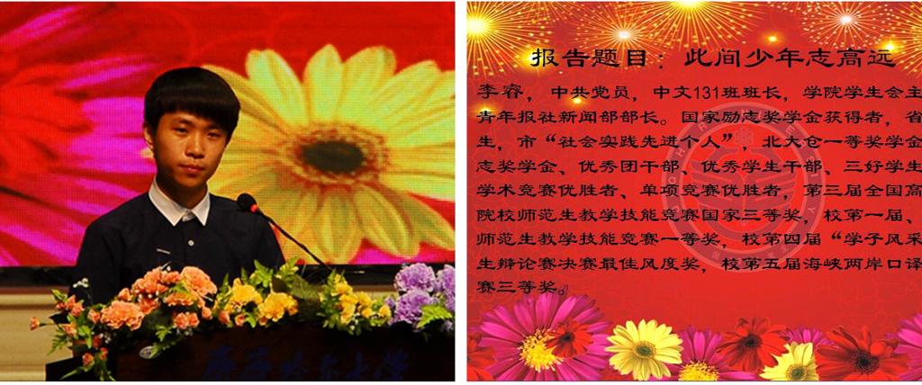5月19日18时30分,报告团首场报告会在中区文化宫举行。常务副校长郑喜群出席了报告会,学生工作部(学生处)部(处)长姜波、副部(处)长张树启、学生工作部(学生处)各科室工作人员及来自全校10个学院共1300余名学生参加了首场报告会。先进事迹报告团中化学与化学工程学院王书晴、通信与电子工程学院佐姗姗、理学院肖利丹、音乐与舞蹈学院时书航、文学与历史文化学院李睿共五名同学与大家分享了他们的成长经历。