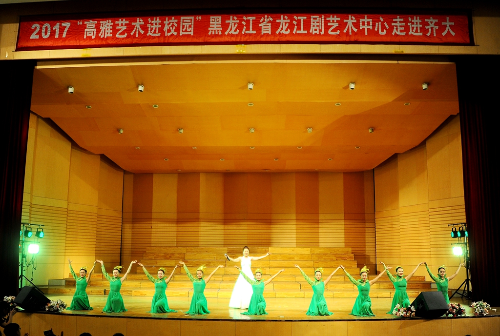 黑龙江省龙江剧艺术中心编排了12个优秀的龙江戏剧歌舞节目。演出在集体舞蹈《冰雪情趣》中拉开了帷幕,龙江少女们精湛的演绎瞬间点燃了全场的热情;男生独唱《悟空》、歌舞快板《放飞文明》、龙江剧小品《非诚勿扰》《刨根问底》、女生独唱《带我到山顶》、龙江剧戏歌《龙江姑娘火辣辣》等一系列极富地方特色的艺术作品,赢得了在场观众的阵阵掌声;由国家一级演员李雪飞、高运来带来的经典龙江剧选段《讲义气可不能心思太乱》,把台下观众的热情带入高潮;笛子独奏《牧民新歌》、女生独唱《芦花》悠扬婉转,武功与舞蹈《武林风》一气呵成、气势磅礴;歌舞《共筑中国梦》把现场气氛推向高潮,赢得在场观众雷鸣般的掌声。师生们沉浸在美妙的乐声中,久久回味。