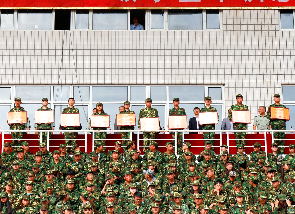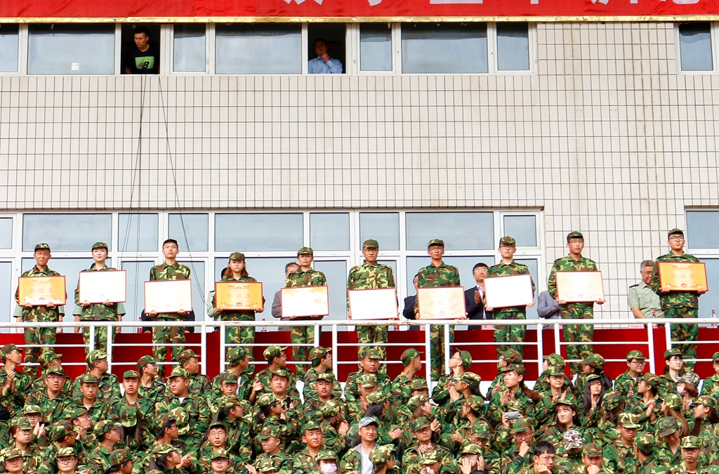 先进营代表、组织奖代表,先进连代表、队列汇操优胜连、内务卫生评比优胜连代表上台领奖,与会军训团成员分别为他们颁奖。