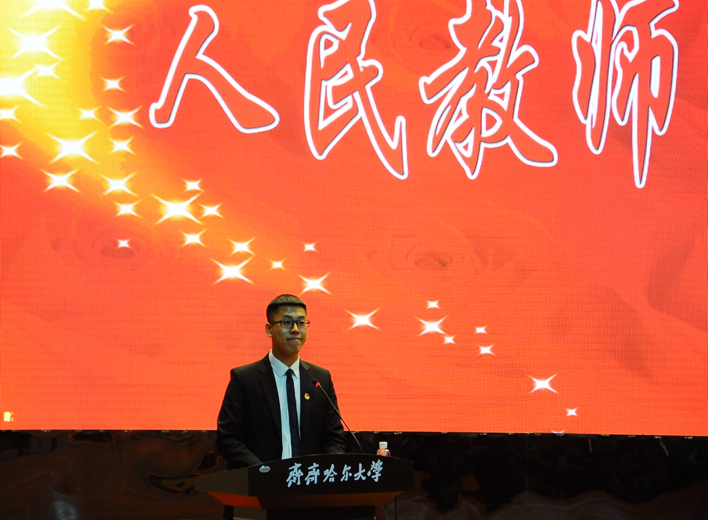 学生代表、校学生会主席、机电工程学院郑祥鹏同学在大会发言。他代表全校同学,向所有默默奉献,耕耘在教学科研一线的老师们致以节日的祝福,并由衷的道一声:“老师,您辛苦了”。他表示,作为学生,我们决心以实际行动更加严格要求自己,以致知、致用、致远的三致学风为指引,努力学习,健康成长,以优异的表现迎接教育部本科教学工作审核评估,用智慧和热情与敬爱的老师们一道,共同续写LETOU国际米兰官网的辉煌,创造更美好的明天!