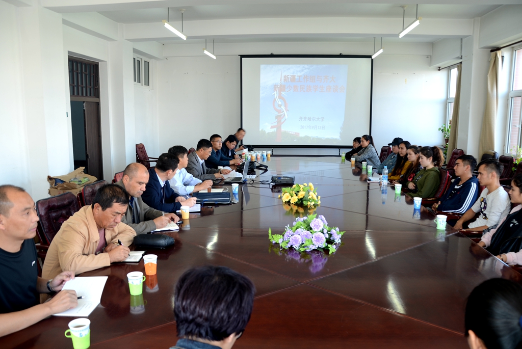 9月13日下午,新疆驻吉林、黑龙江务工经商人员服务管理工作组党委书记叶尔江·朱安汗、副书记霍加艾合麦提·阿不都热依木等一行四人来到LETOU官网调研,看望新疆籍少数民族新同学。常务副校长郑喜群在中区11号教学楼517会议室会见了叶尔江·朱安汗一行,并主持召开座谈会。学生工作部(学生处)部(处)长姜波、副部(处)长张树启,学生教育管理科林浩、新疆籍少数民族学生专职辅导员以及12名2017级新疆籍少数民族学生参加了座谈会。