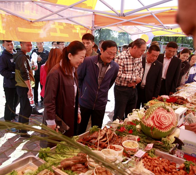 学校党委副书记齐宏伟,副校长王刚,学校办公室主任张德庆、学生工作部(学生处)部(处)长姜波、后勤管理处处长尹鸥、后勤管理处副处长杨庆忠、后勤管理处副处长杜立群等出席了活动并与师生进行交流。数千名师生和市民参观、选购、品尝大学校园美食,体验高校餐饮文化,畅享校园美食盛宴。