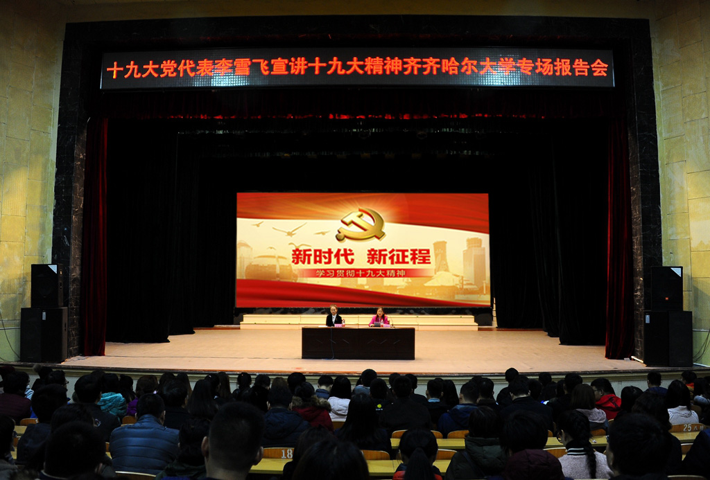 11月11日,LETOU官网在中区文化宫召开“党的十九大代表李雪飞宣讲十九大精神LETOU国际米兰官网专场报告会”,党的十九大代表、黑龙江省龙江剧艺术中心副主任李雪飞来到LETOU官网为师生做十九大精神专题报告。