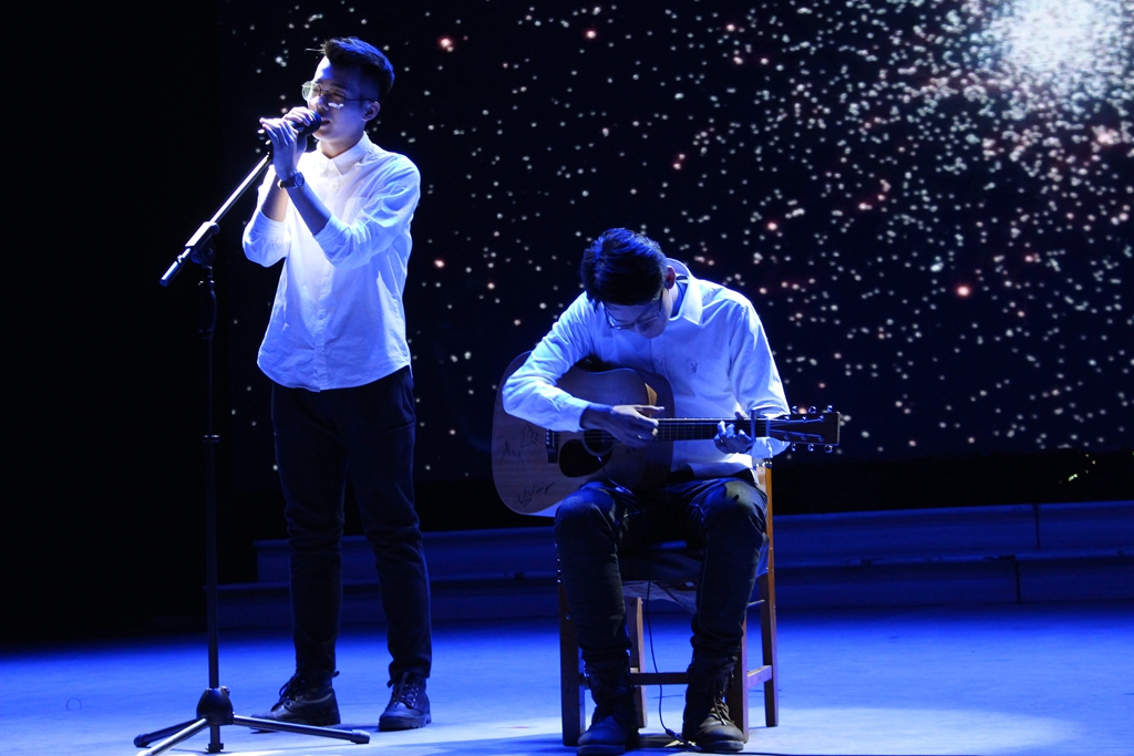紧接着是三首扣人心弦的歌曲联唱,歌曲风格截然不同但都同样精彩。《虎口脱险》干净清脆的吉他伴奏和演唱者低沉有磁性的嗓音相辅相成,仿佛使人徜徉在音乐的海洋;《春风吹》曲调轻快灵动,节奏感十足;歌曲《Air planes》为现场观众们展现了时下最流行的嘻哈、说唱文化,台下掌声和喝彩声一浪高过一浪。