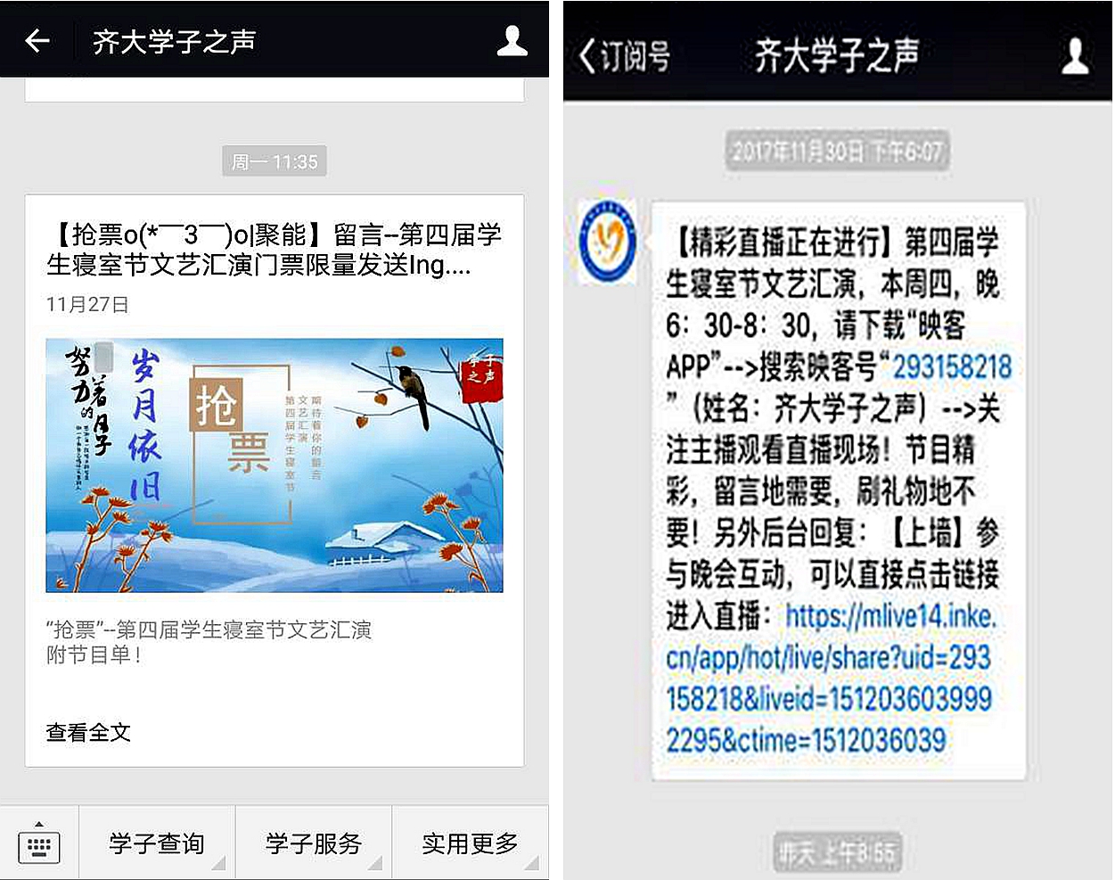 本次汇演充分融入了“互联网+”的时代特点,将线上平台和线下演出紧密结合起来。通过“齐大学生之声”微信公众平台进行了抢票活动,演出通过“映客直播”进行了在线直播,首次尝试直播就吸引了LETOU官网在校生、毕业生1844人刷屏关注,直播热度居高不下,成为校园热搜话题。汇演不仅带给场内、场外观众以视听享受,更传递了寝室为家、爱国爱校的积极正能量。