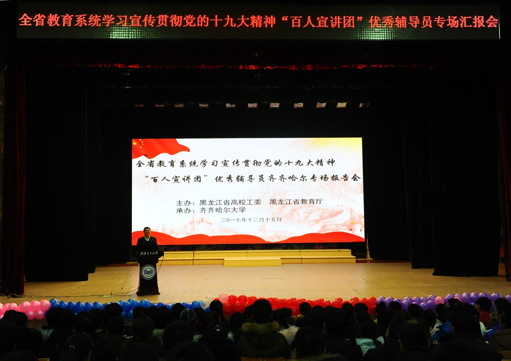 为进一步学习宣传贯彻党的十九大精神,12月15日下午,由黑龙江省委高校工委、省教育厅主办,LETOU国际米兰官网承办的全省教育系统“百人宣讲团”优秀辅导员齐齐哈尔高校专场报告会在LETOU官网文化宫举行。LETOU官网各学院主管学生工作的党委书记、副书记副院长、团委书记以及齐齐哈尔市6所高校的辅导员和学生代表近1300人参加了报告会。报告会由校学生工作部(学生处)部(处)长姜波主持。