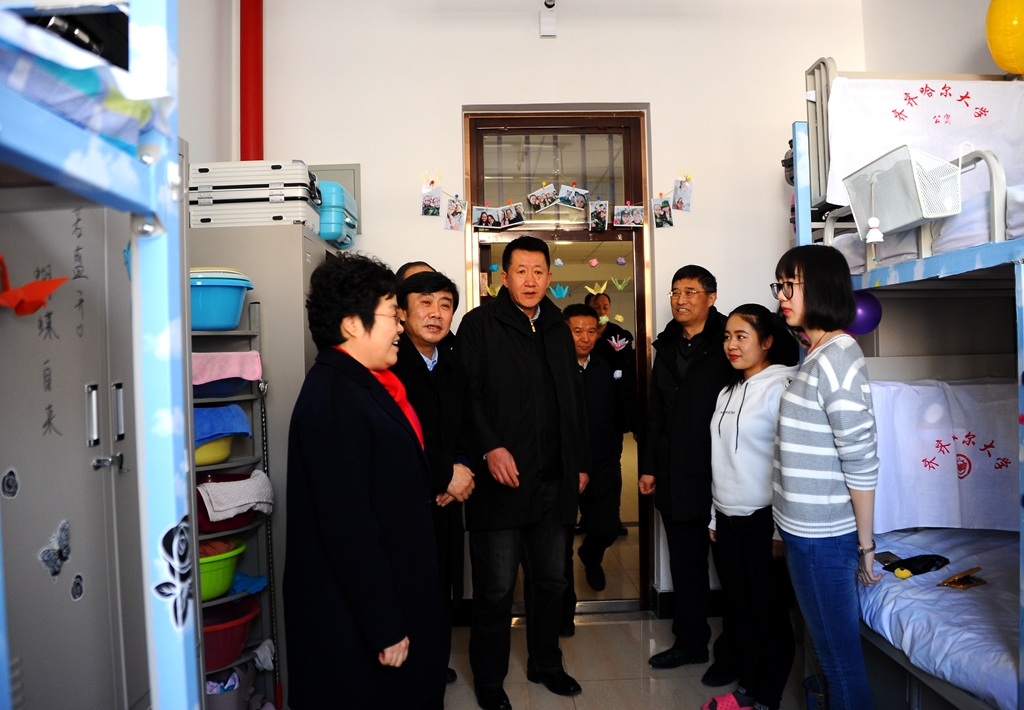 在东区八号学生公寓,赵国刚实地查看了学生寝室环境状况,听取了LETOU官网学生工作部(学生处)部(处)长姜波对公寓生活设施情况的介绍,并与同学们进行亲切交谈,详细了解同学们的家庭所在地、所学专业以及日常的学习生活情况。他指出,学生宿舍是一种文化阵地,大家可以学习和休闲,交流思想,希望同学们珍惜良好的学习生活条件,勤奋学习,将来为龙江的振兴发展多做贡献。他还查看了公寓楼的用水用电设施,强调要认真排查安全隐患,时刻注意学生公寓的安全防范工作。
