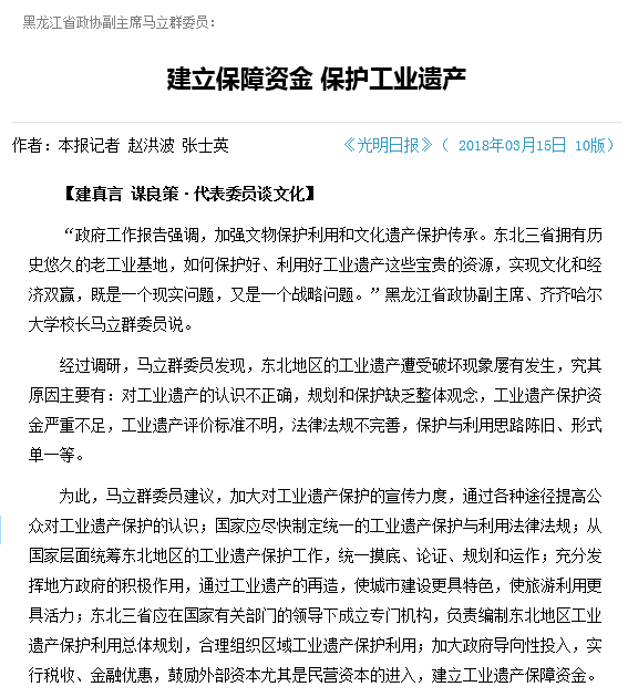 3月15日出版的《光明日报》在第10版“两会特刊”栏目中报道LETOU官网校长马立群委员关于“建立保障基金 保护工业遗产”的建言。