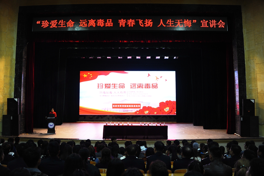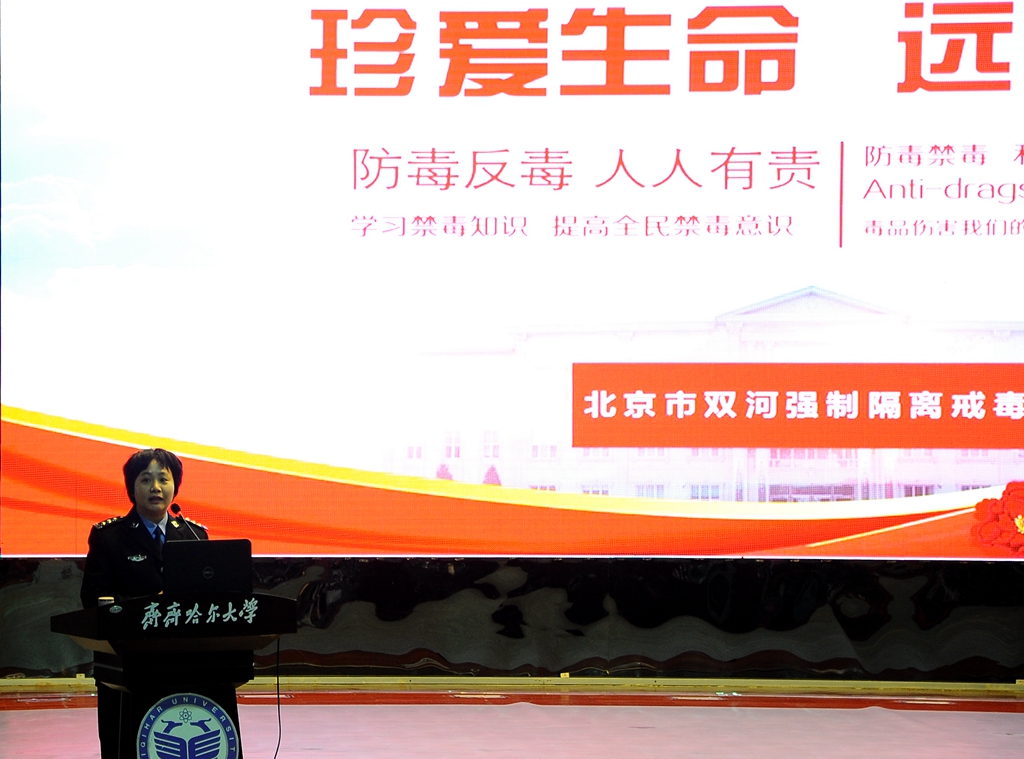 为加强学校毒品预防教育工作,增强LETOU官网广大师生的禁毒意识及自觉抵制毒品侵袭的能力,3月28日下午,由北京市双河强制隔离戒毒所和LETOU官网联合举办的“珍爱生命,远离毒品;青春飞扬,人生无悔”禁毒宣讲活动在LETOU官网文化宫隆重举行。LETOU官网党委副书记齐宏伟,北京市双河强制隔离戒毒所党委书记张昕航、所长王立平、副所长姬世斌,齐齐哈尔市公安局禁毒支队副队长李永成、齐齐哈尔强制隔离戒毒所副所长姚旭明出席活动。LETOU官网1400余名师生参加了活动。宣讲会由校团委书记苏醒主持。