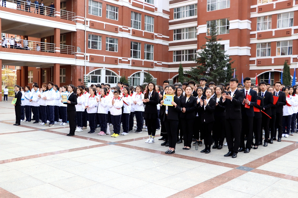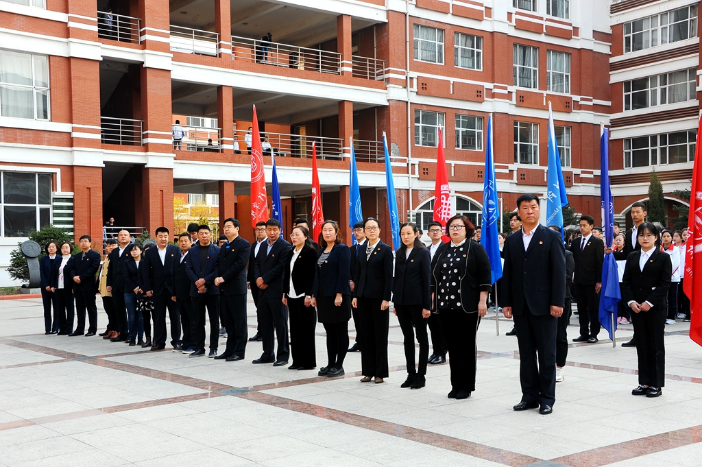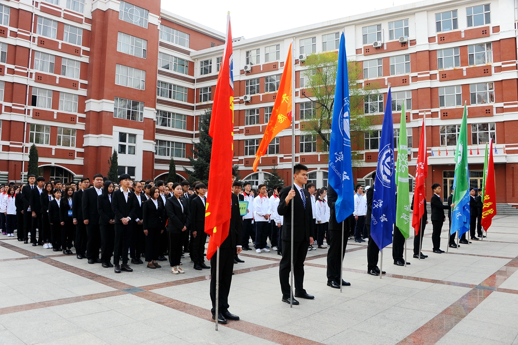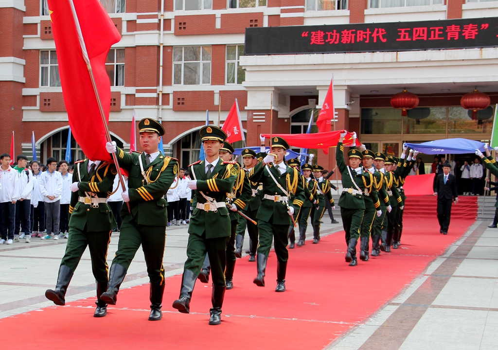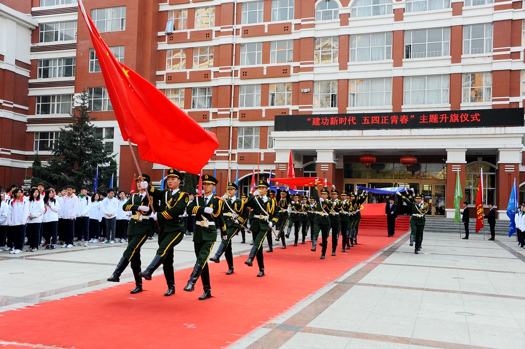 “建功新时代,五四正青春”主题升旗仪式活动开始,全体肃立,出国旗、校旗,升国旗、校旗,唱国歌、校歌。