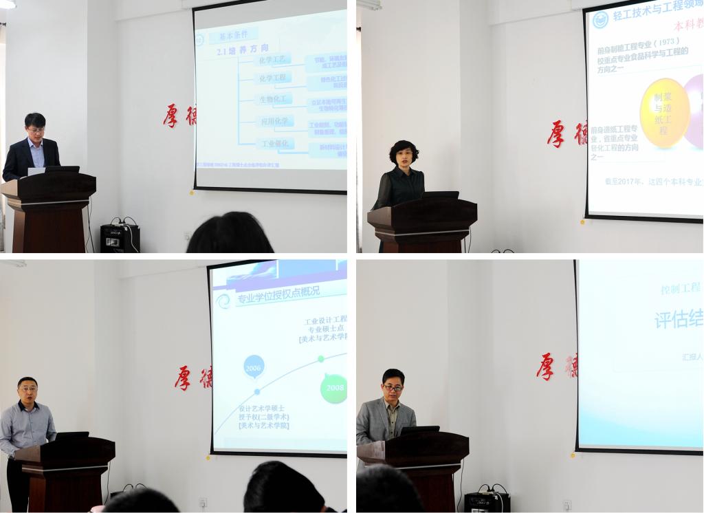 随后,化学工程与技术、材料科学与工程、化学等3个一级学科学术学位授权点以及材料工程、化学工程、轻工技术与工程、工业设计工程、控制工程、计算机技术、电子与通信工程等7个工程硕士领域负责人分别结合本授权点情况,从目标与标准、基本条件、人才培养三个方面对本学科(工程领域)的自评结果进行了详细的汇报。