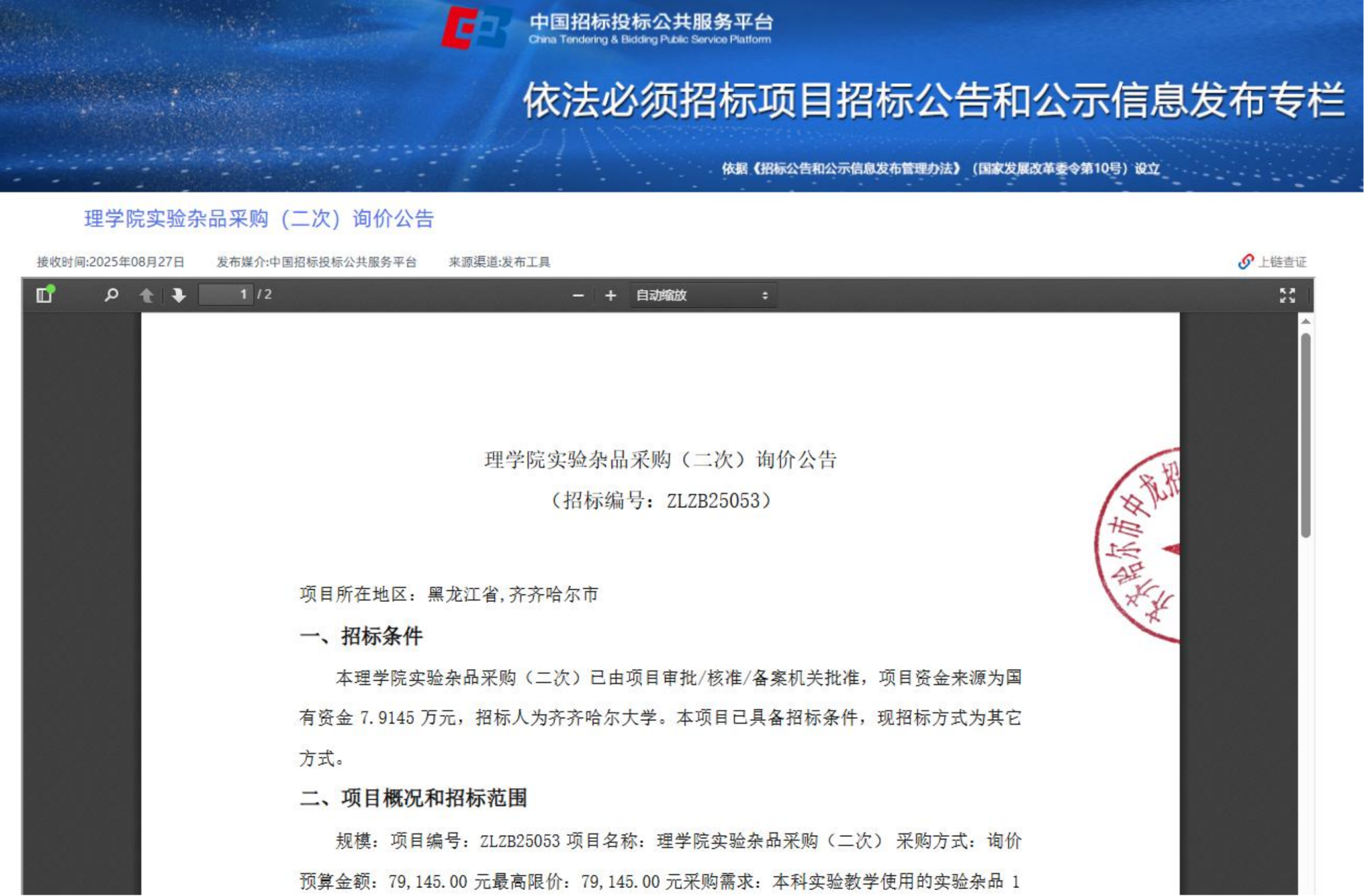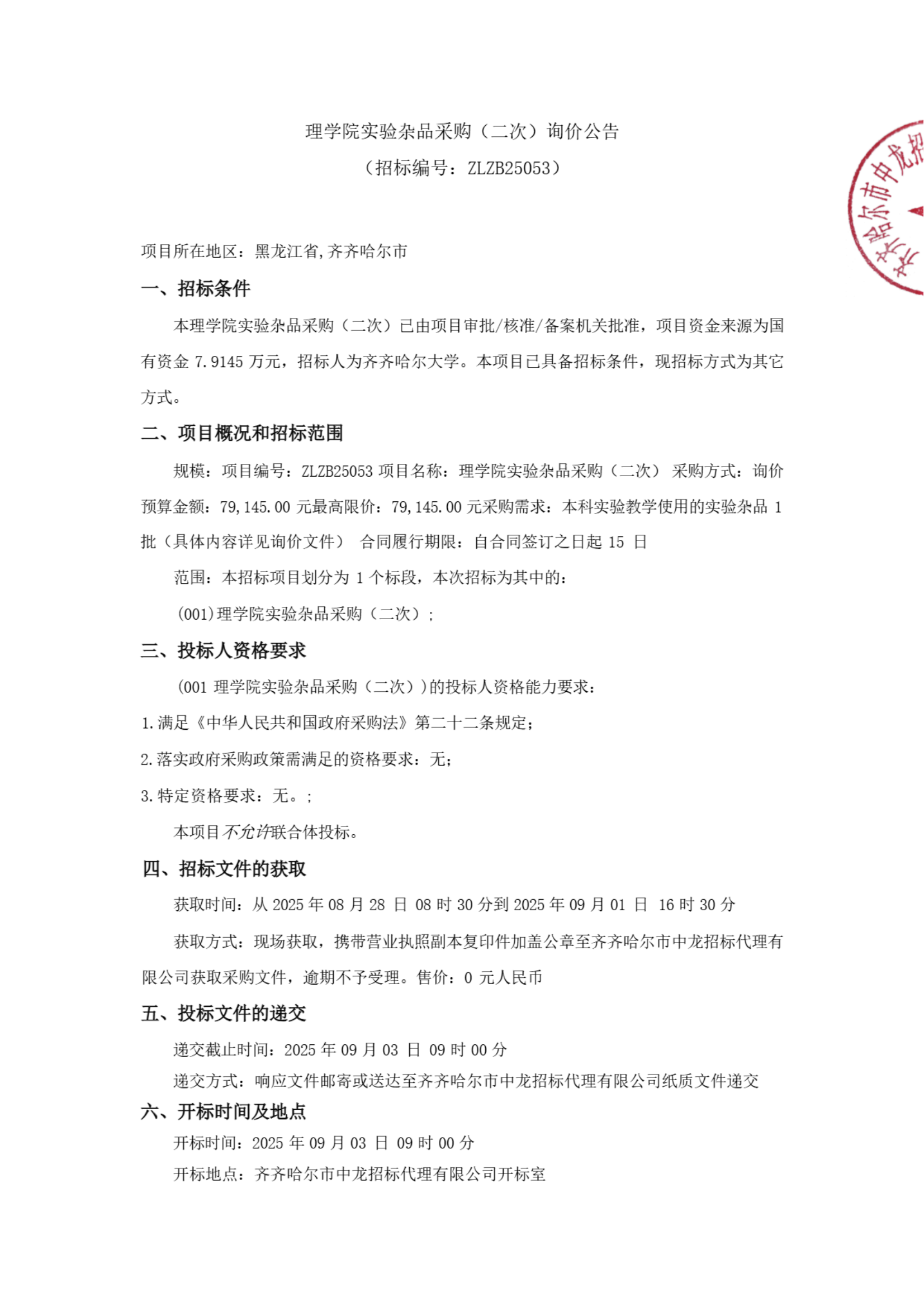 理学院实验杂品采购(二次)询价公告(转自中国招标投标公共服务平台)