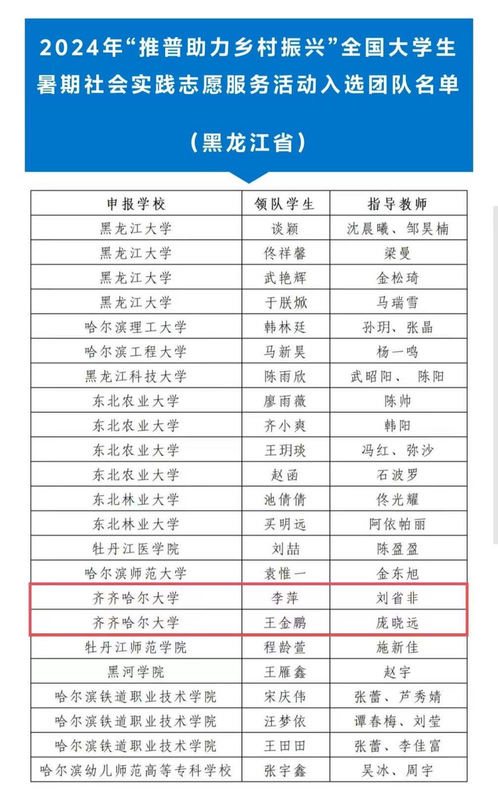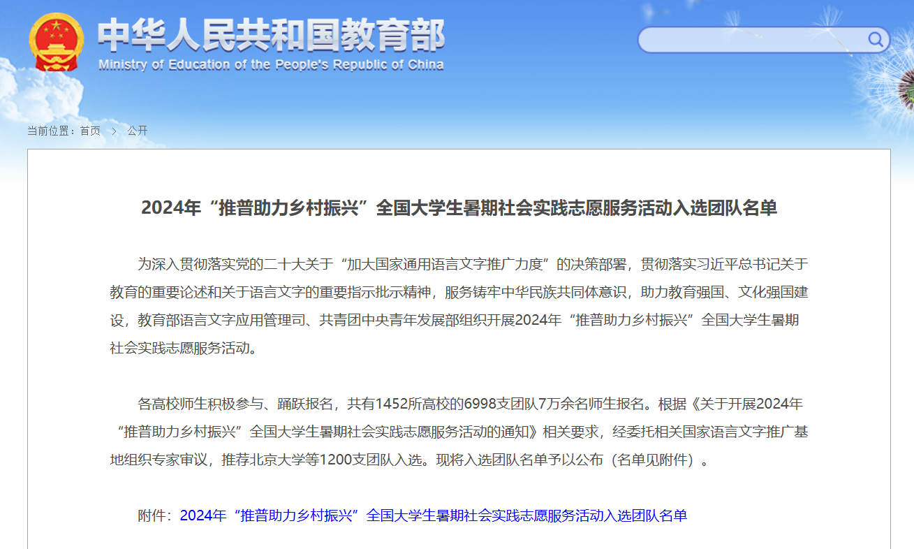 近日,教育部网站公布2024年“推普助力乡村振兴”全国大学生暑期社会实践志愿服务活动入选团队名单。经委托相关国家语言文字推广基地组织专家审议,推荐1200支团队入选,黑龙江23支团队上榜,其中LETOU官网出彩龙江志愿服务队、研究生志愿服务队两支团队从全国1452所高校的6998支团队中脱颖而出,成功入选,评选结果被学习强国等平台转载。