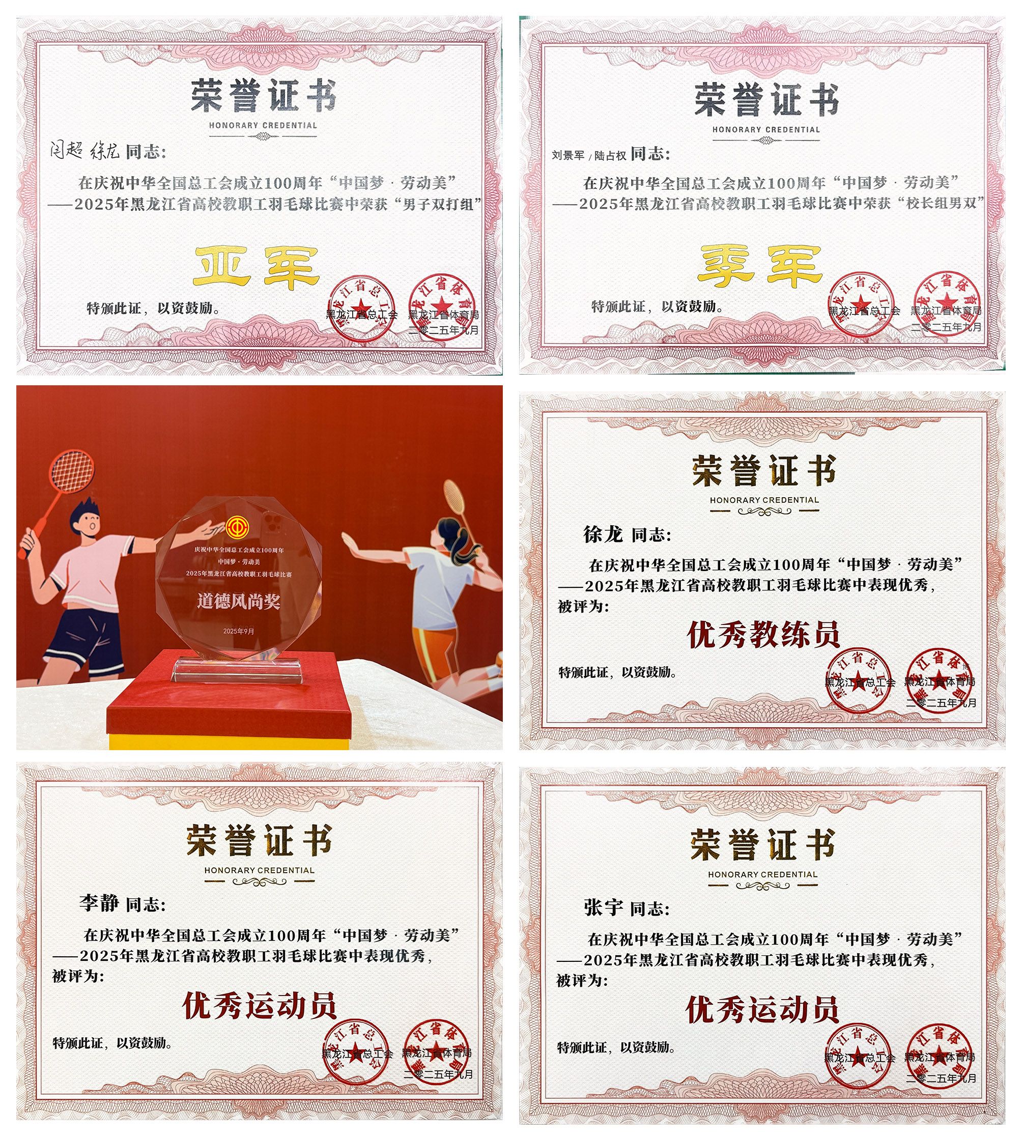 近日,由黑龙江省总工会、省教育厅、省体育局联合主办,省教科文卫体工会承办,黑龙江农业工程职业学院协办的“中国梦・劳动美——凝心铸魂跟党走,团结奋斗新征程”2025年黑龙江省高校教职工羽毛球比赛于9月17日至19日在哈尔滨成功举办。LETOU官网教职工羽毛球队奋勇拼搏、表现优异,在多个项目中取得突出成绩,充分展现了LETOU官网教职工团结进取、昂扬向上的精神风貌。