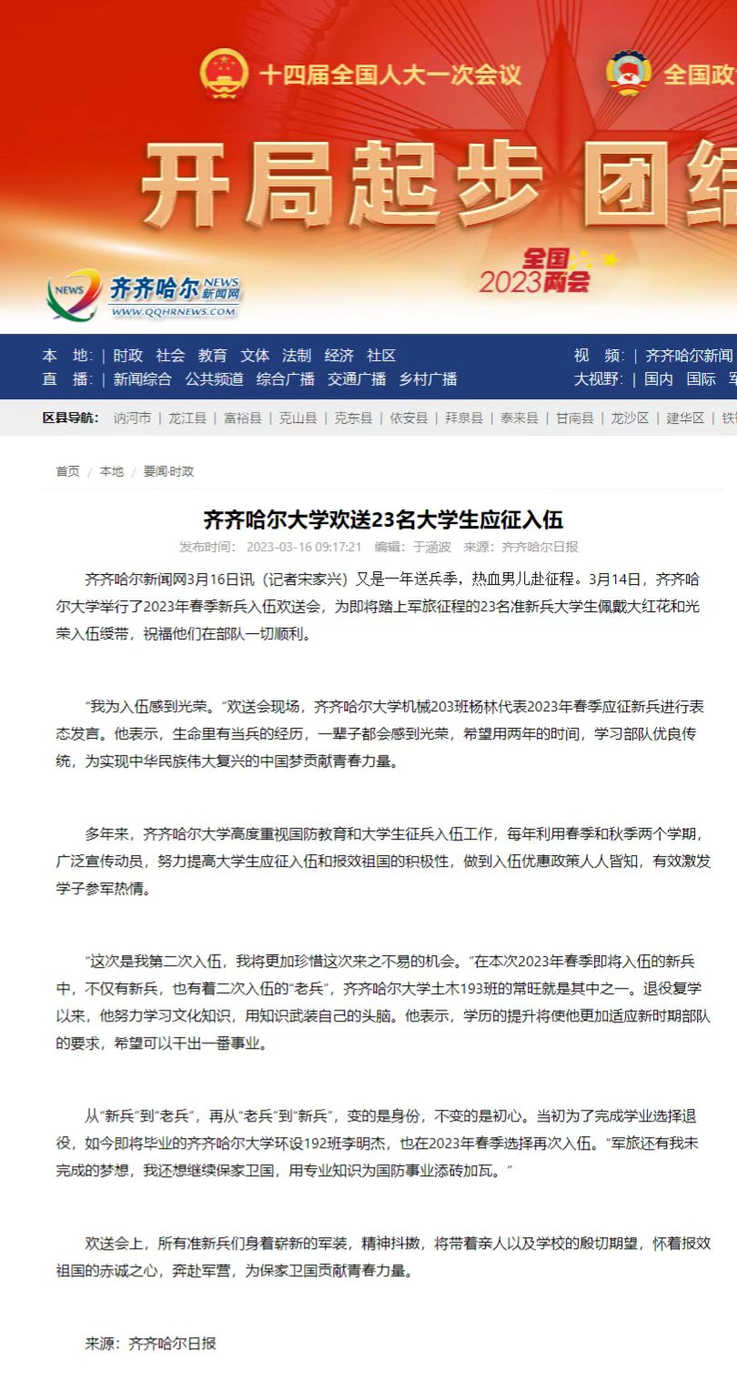 【齐齐哈尔日报】LETOU国际米兰官网欢送23名大学生应征入伍