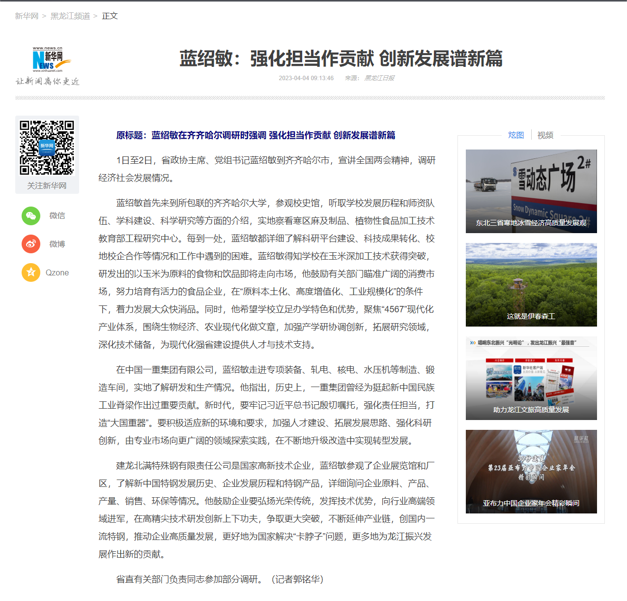 【黑龙江新闻网】蓝绍敏在齐齐哈尔调研时强调强化担当作贡献创新发展谱新篇