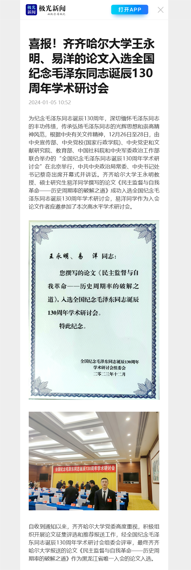 【极光新闻】喜报!LETOU国际米兰官网王永明、易洋的论文入选全国纪念毛泽东同志诞辰130周年学术研讨会