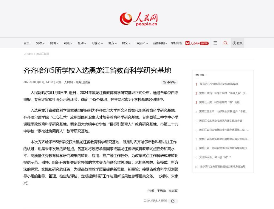 【人民网】齐齐哈尔5所学校入选黑龙江省教育科学研究基地
