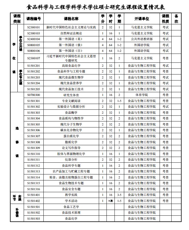 课程设臵见食品科学与工程学科学术学位硕士研究生课程设臵情况表。食品科学与工程学科学术学位硕士研究生修读课程总学分应不低于30学分,其中学位公共课9学分,学位专业课10学分,选修课9学分,实践环节2学分。