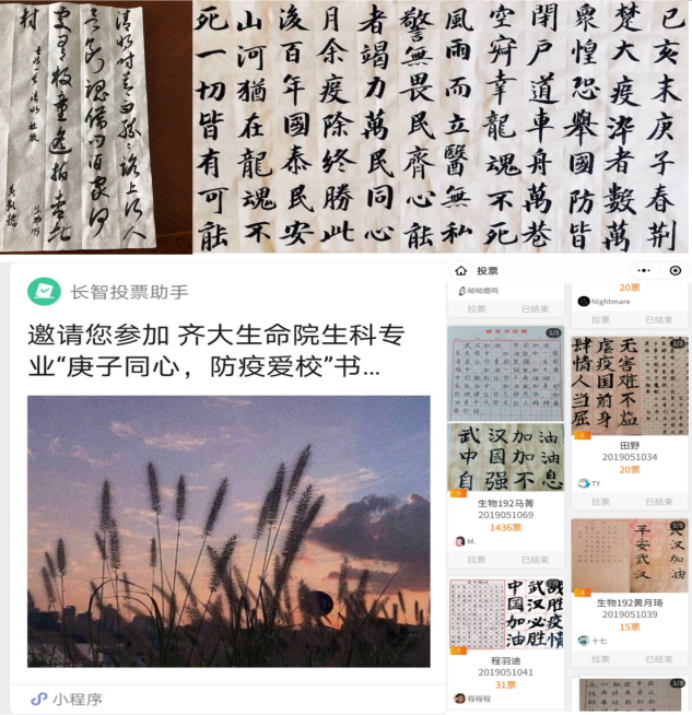 为帮助同学们了解新型冠状病毒的危害和疫情的严峻形势,提高同学们的预防意识,结合生物科学学科特点,通过网络投票的形式举办了“庚子同心,防疫爱校”思维导图和书法作品大赛,其中思维导图比赛针对2017和2018级生物科学专业学生展开,活动期间(2020年2月26日-3月1日)共有196名同学报名参加,总投票数为24795票,总访问量达65798次。全体2019级生物科学专业学生参加了书法作品比赛,从2020年2月18日上传作品,至3月1日活动结束,总投票人数为3343人,总票数达26071票。同学们参与活动热情高涨,作品内容紧紧围绕防范疫情,爱国爱校,通过活动激发了同学们学习的热情,缓解了紧张的情绪。全院教师也对积极参与此系列活动的评选,并对活动目的和作品内容大加赞赏。
